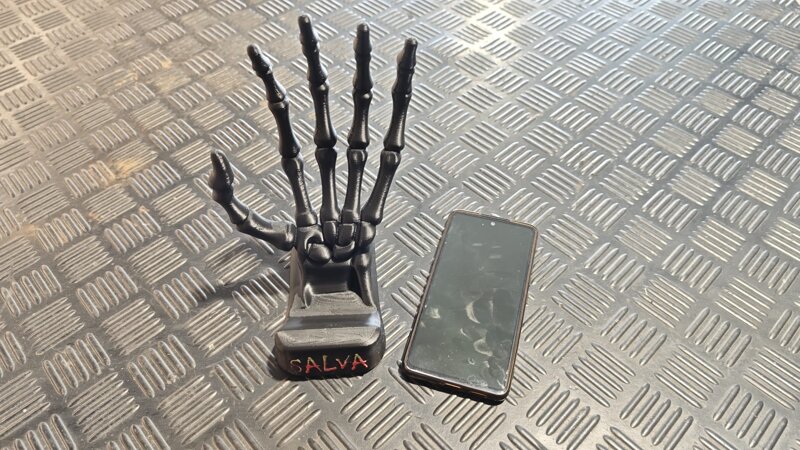 Soporte para teléfono móvil con mano esquelética. Opción de personalización en color y texto.
